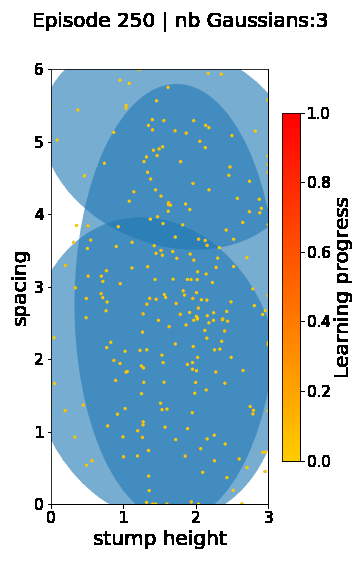 The following videos provide visualizations of the environment sampling trajectory observed in a representative ALP-GMM run when paired with a short (left), default (middle) and quadrupedal (right) walker. In each frame, blue shades represent the Gaussians of the current mixture while dots represent sampled environments.