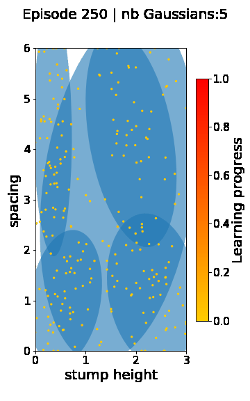 Following this insight, LP was later applied to automate curriculum learning for efficient learning of skills in robots. For example, RIAC and Covar-GMM are two curriculum learning algorithms for continuous environment spaces that were paired with simple population-based DMP controllers. In both approaches, the sequential task selection problem is transformed into an EXP4 Multi-Armed Bandit (MAB) setup in which arms are dynamically mapped to subspaces of the task/environment space, and whose utilities are defined using a local LP measure. The objective is then to optimally select on which subspace to sample an environment in order to maximize LP. In RIAC, arms are defined as hyperboxes over the environment space, their utility is the difference of reward between old and recent environments sampled from the hyperbox. In Covar-GMM, the arms of the MAB are gaussians from a Gaussian Mixture Model. The GMM is periodically fited on tuples composed of an environment’s parameter vector concatenated to its associated reward (obtained by the student) and its relative time value.