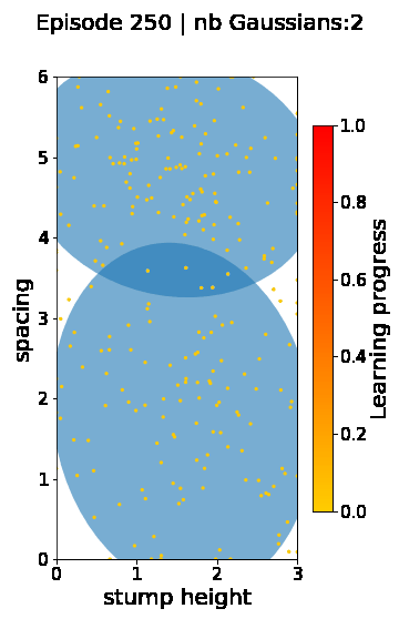 The GMM is fit periodically on a window $\mathcal{W}$ containing only the most recent parameter-ALP pairs (here the last $ 250 $) to bound its time complexity and make it more sensitive to recent high-ALP subspaces. The number of Gaussians is adapted online by fitting multiple GMMs (here having from $2$ to $k_{max}=10$ Gaussians) and keeping the best one based on Akaike’s Information Criterion. Note that the nearest neighbor computation of per-parameter ALP uses a database that contains all previously sampled parameters and associated episodic rewards, which prevents any forgetting of long-term progress. In addition to its main environment sampling strategy, ALP-GMM also samples random parameters to enable exploration (here $p_{rnd}=20%$).