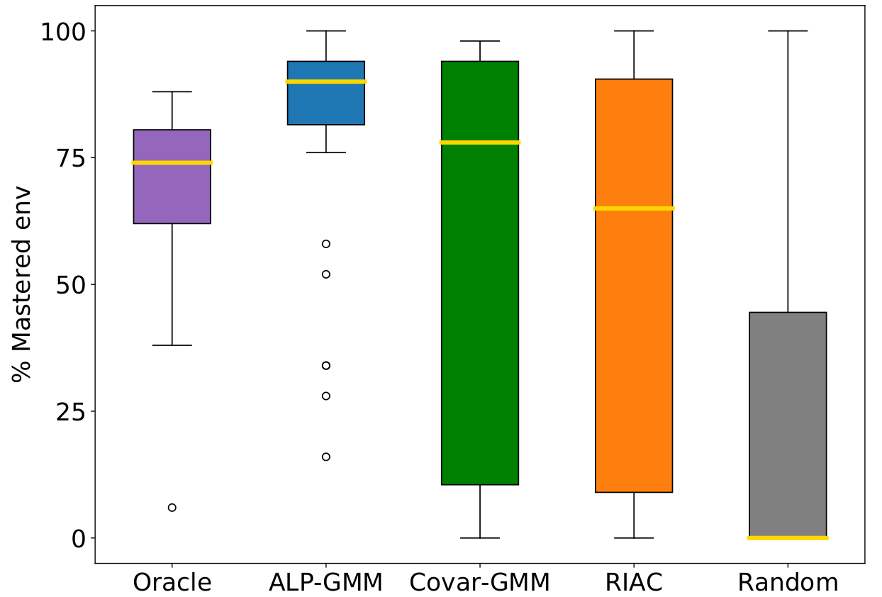 We analyzed the distributions of the percentage of mastered environments of the test set after training for $80$ Millions (environment) steps, depicted in the figure below (left plot). One can see that ALP-GMM both has the highest median performance and narrowest distribution. Out of the $32$ repeats, only Oracle and ALP-GMM always end-up with positive final performance scores whereas Covar-GMM, RIAC and Random end-up with $0%$ performance in $8/32$, $5/32$ and $16/25$ runs, respectively. Interestingly, in all repeats of any condition, the student manages to master part of the test set at some point (i.e non-zero performance), meaning that runs that end-up with $0%$ final test performance actually experienced catastrophic forgetting. This showcase the ability of ALP-GMM to avoid this forgetting issue through efficient tracking of its student’s absolute learning progress.