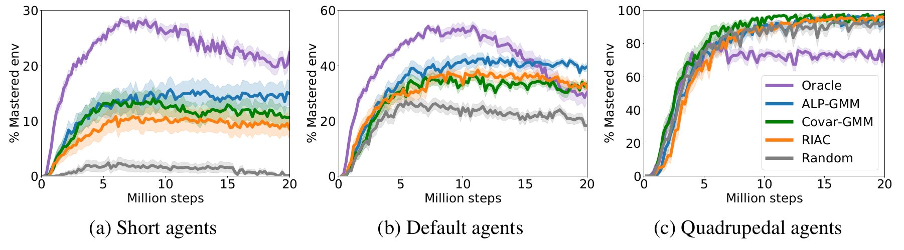 The figure above shows learning curves for each condition paired with short (a), default (b) and quadrupedal (c) walkers. First of all, for short agents, one can see that Oracle is the best performing algorithm, mastering more than $20$% of the test set after $20$ Million steps. This is an expected result as Oracle knows where to sample simple track distributions, which is crucial when most of the parameter space is unfeasible, as is the case with short agents. ALP-GMM is the LP-based teacher with highest final mean performance, reaching $14.9$% against $10.6$% for Covar-GMM and $8.6$% for RIAC. This performance advantage for ALP-GMM is statistically significant when compared to RIAC (Welch’s t-test at 20M steps: $p<0.04$), however there is no statistically significant difference with Covar-GMM ($p=0.16$). All LP-based teachers are significantly superior to Random ($p<0.001$). For details on how to use statistical tests for Deep RL, check this blog.