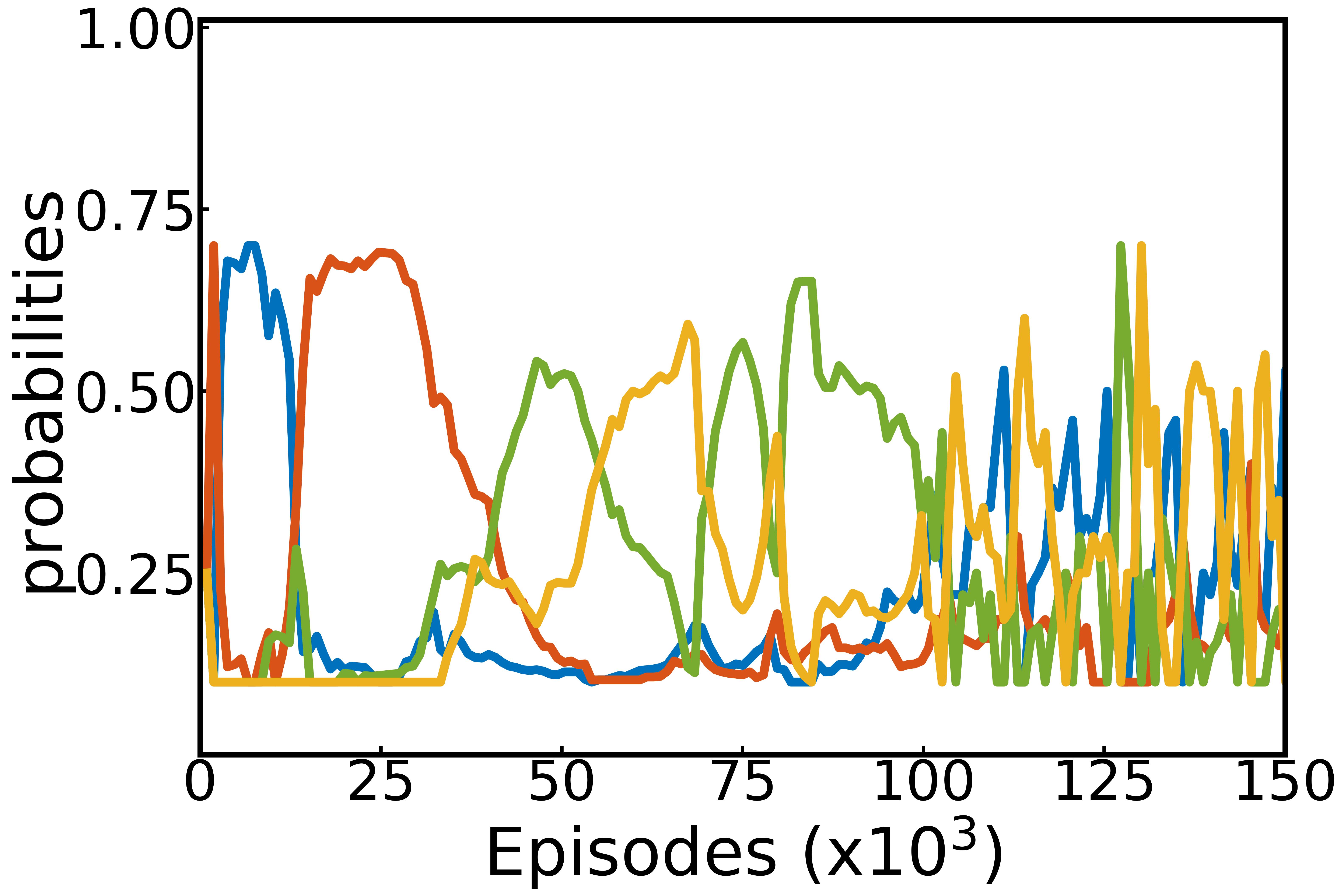 The problem of module selection can be seen as a non-stationary multi-armed bandit problem, where the value to maximize is the absolute learning progress. We compute selection probabilities using an epsilon-greedy proportion rule based on the absolute measures of learning progress: