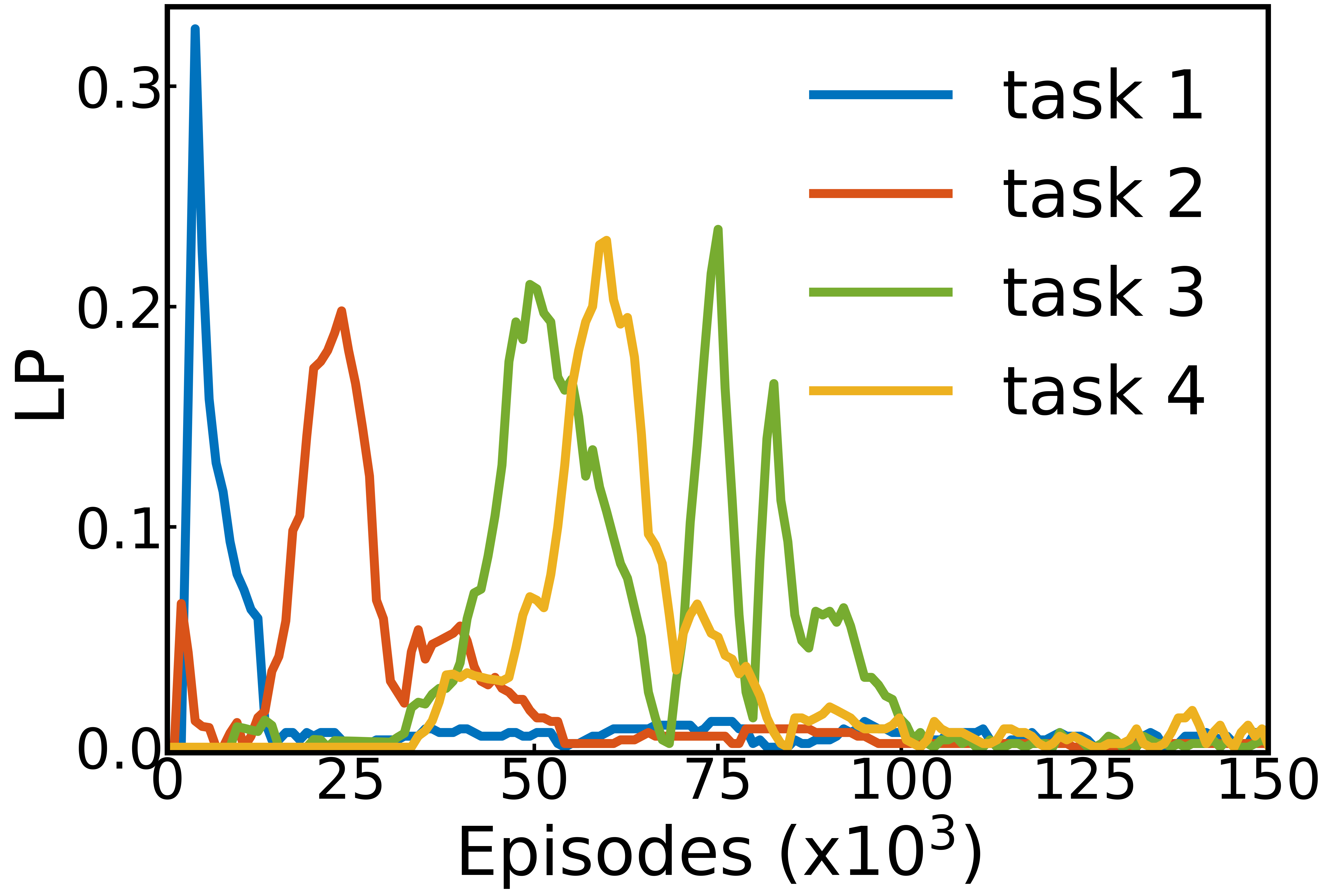 Around $75.10^3$ episodes, the agent detects a drop in its competence in the Pick and Place module, this triggers an increase of the absolute progress which ultimately results in a renewed focus on that module, enabling to mitigate the performance drop. Using the absolute value of learning progress helps to resist forgetting.